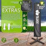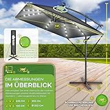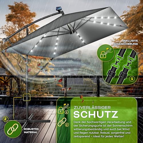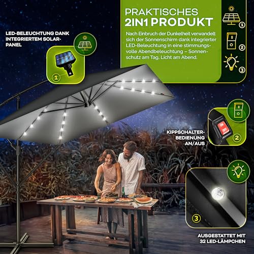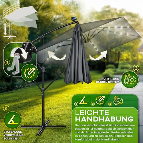 tillvex® Alu Sonnenschirm Rechteckig Ø 330 cm mit LED Solar Anthrazit + Abdeckung mit Kurbel | Ampelschirm mit Ständer & Windschutz | Gartenschirm UV-Schutz, wasserdicht, 360° drehbar | Kurbelschirm Marktschirm TVESNS-009