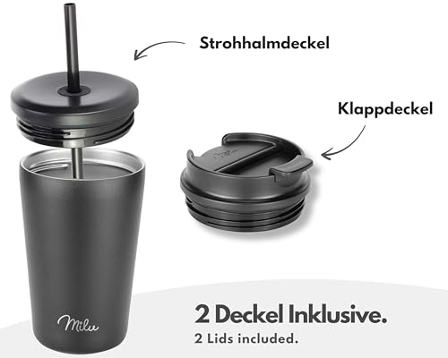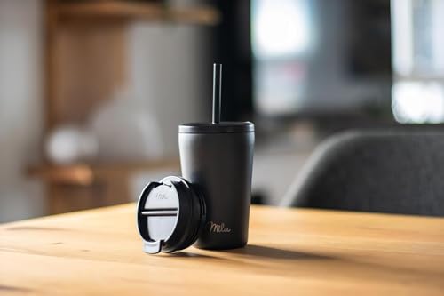 Milu Thermobecher 300ml - 100% Auslaufsicher - Edelstahl Kaffeebecher to go isoliert mit Strohhalm hält 10h heiß / 20h kalt, BPA-frei (Schwarz, 300ml)