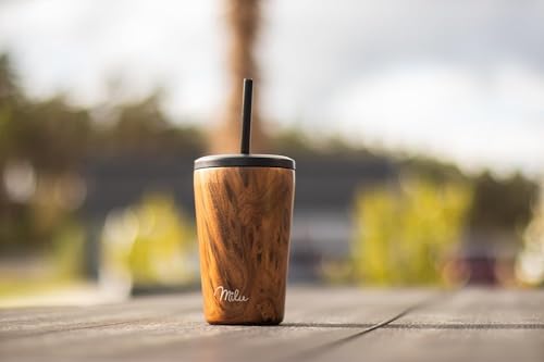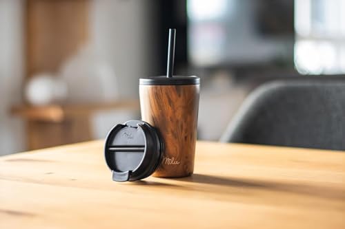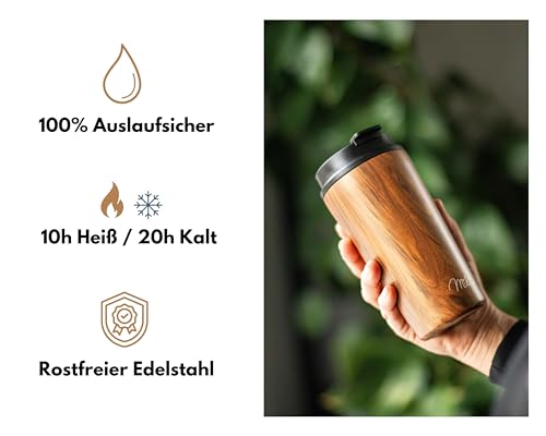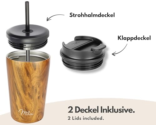Milu Thermobecher 500ml - 100% Auslaufsicher - Edelstahl Kaffeebecher to go isoliert mit Strohhalm hält 10h heiß / 20h kalt, BPA-frei (Holzoptik, 500ml)