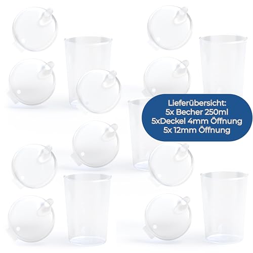 Horn Medical 5er Pack Erwachsenen Trinkhilfen 250ml Schnabelbecher PLUS 5 Deckel für Flüssigkeiten & 5 Deckel für Brei/Mus - Farbe wählbar (Transparent)