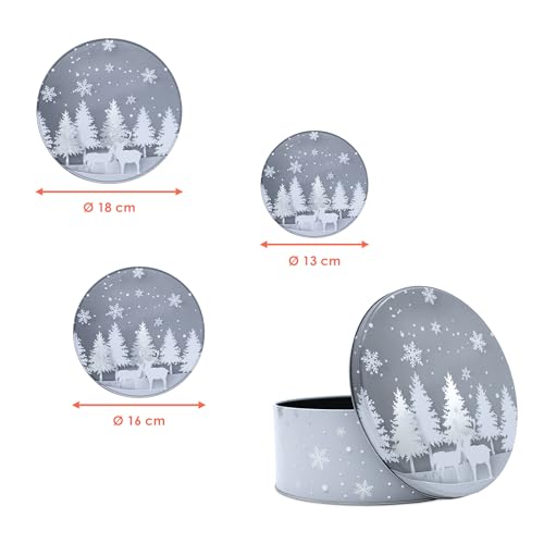 Spetebo Metall Gebäckdose 3er Set 19/16 / 13 cm grau - WINTER - Runde Keksdosen mit weihnachtlichem Motiv - Plätzchen Keks Gebäck Vorrats Geschenk Dose ineinander stapelbar