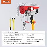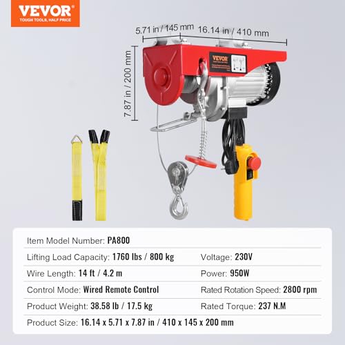 VEVOR Elektrischer Flaschenzug, 1760 lbs 230 V elektrische Seilwinde mit 14 Fuß kabelgebundener Fernbedienung, 40 Fuß Hubhöhe mit Einzelkabel, Einzel-/Doppelschlingen, Not-Aus, Hebezeug PA800