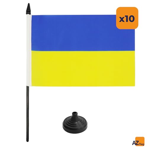 AZ FLAG - Set mit 10 ukrainischen Tischflaggen, 21 x 14 cm – 10 kleine ukrainische Büroflaggen, 100% Polyester, mit Fahnenstange von 25 cm und Sockel aus schwarzem Kunststoff