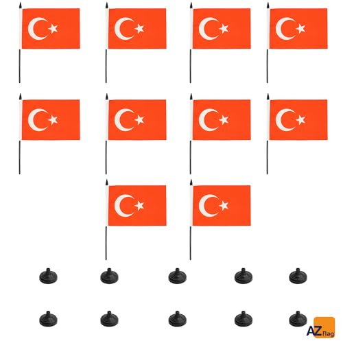 AZ FLAG - 10 Stück Tischflagge Türkei 21 x 14 cm – 10 kleine türkische Büroflaggen aus 100% Polyester mit Fahnenstange von 25 cm und Sockel aus schwarzem Kunststoff