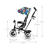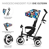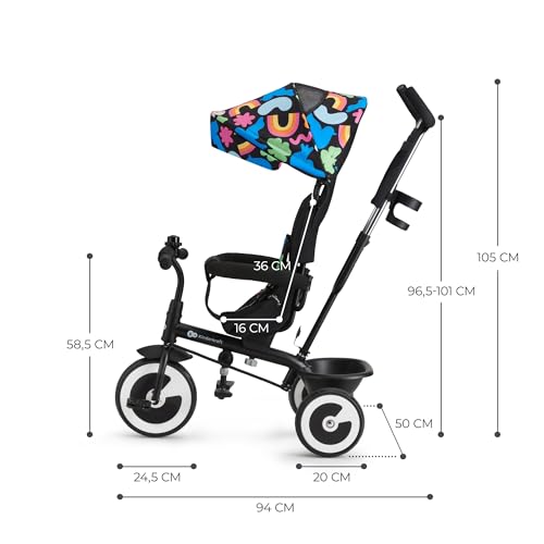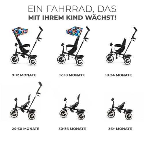 Kinderkraft Aston Dreirad ab 9 Monate bis 25 kg, Kinderdreirad mit schubstange, drehbarer Sitz Vorwärts und Rückwärtsfahrt, ausklappbarem Verdeck mit Sonnenschutz, Happy Shapes