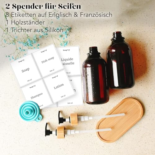 2 Spender 50 cl für Seife, Shampoo, Geschirrspülmittel | Bambushalter, Trichter & Etiketten zum Selbstgestalten | Praktisches Küchen und Badezimmerzubehör | OriginalCorner®