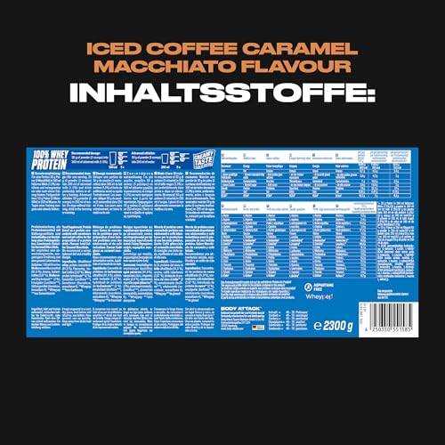 Body Attack 100% Whey Protein Iced Coffee Caramel Macchiato, 2,3 kg - Made in Germany - cremiges Eiweißpulver mit Hydrolysat und BCAA´s, unterstützt Muskelaufbau und Diäten, für Sportler & Athleten