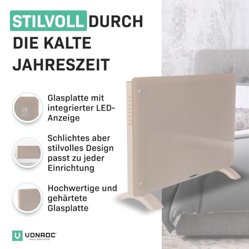 VONROC Luxury electric heater - Konvektorheizung mit Glasscheibe - 750W/1500W - Beheizt Räume bis zu 18m2 - Gesteuert sowohl mit App (über Wifi) als auch manuell - Einstellbarer Thermostat und Timer - Beige