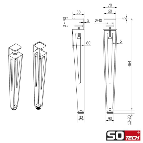 So-tech - sotech Tischbein ColorLine in F-Form konisch zulaufend von 70 auf 40 mm mit Klemmschraube (ohne Bohren) für Beistelltisch, Couchtisch, Bank