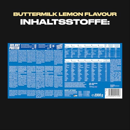Body Attack 100% Whey Protein Buttermilk Lemon, 2,3 kg - Made in Germany - extra cremiges Eiweißpulver mit Hydrolysat und BCAA´s, unterstützt Muskelaufbau und Diäten, für alle Sportler & Athleten