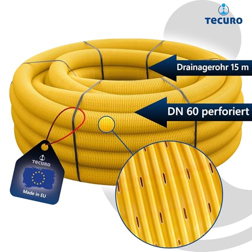 tecuro Drainagerohr flexibel 15 m - DN60 gewellt PVC-U, geschlitzt gelb, für Tiefbau, Garten und Landschaftsbau, PVC-U DIN 1187 güteüberwacht