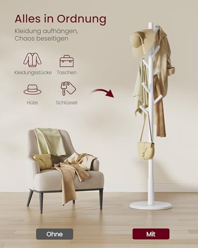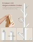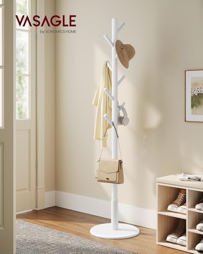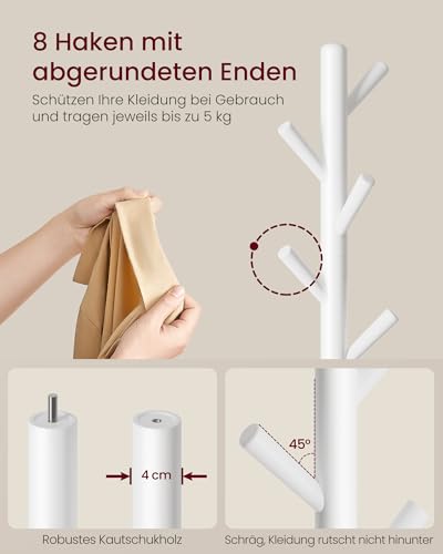 VASAGLE Garderobenständer, Kleiderständer Massivholz, Jackenständer Baumform, 8 Haken für Jacken, Hüte, für Flur, Haken und Haltestange aus Kautschukholz, wolkenweiß RCR009WH01