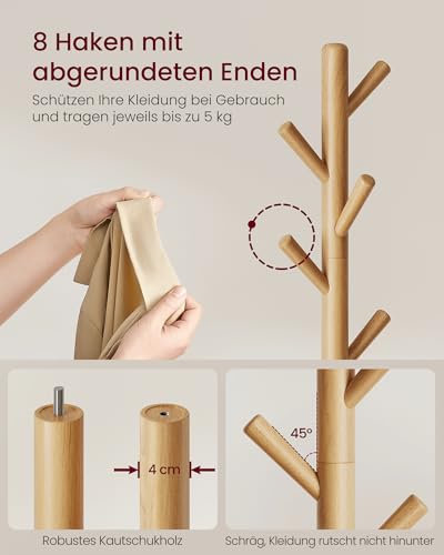 VASAGLE Garderobenständer, Kleiderständer Massivholz, Jackenständer Baumform, 8 Haken für Jacken, Hüte, für Flur, Haken und Haltestange aus Kautschukholz, naturfarben RCR009YK01