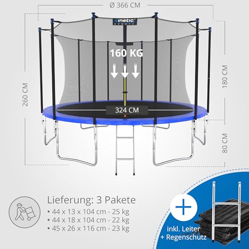 KINETIC SPORTS Trampolin Outdoor Salto Plus Ø 183/244/305/366/400/430/490 cm - Komplett-Set für Kinder, USA Sprungtuch, Netz, Randpolster, Leiter - bis zu 160kg Blau-2 Ø 366 cm Ø 366 cm, Blau-2