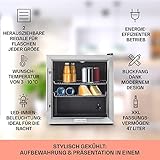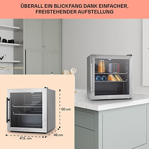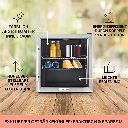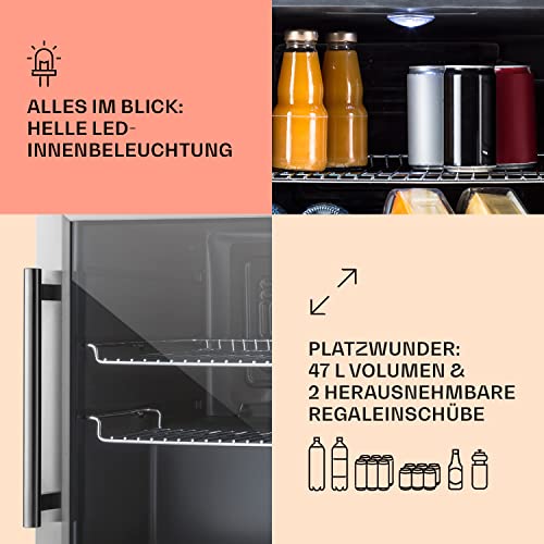 Klarstein Getränkekühlschrank, Kühlschrank Klein mit 2 Ablagen, Minikühlschrank Lautlos für Büro Camping Outdoor mit Glastür, Mini Fridge 3-10°C, Bierkühlschrank 47L, Silber/Schwarz
