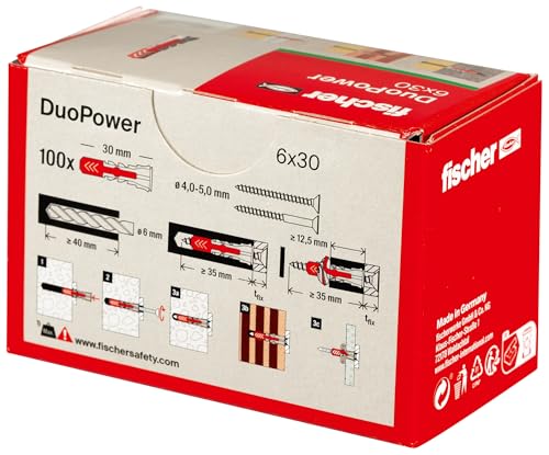 fischer DuoPower 6 x 30, Universaldübel, leistungsstarker 2-Komponenten-Dübel, Kunststoffdübel zur Befestigung in Beton, Ziegeln, Stein, Gipskarton uvm., ohne Schrauben, 100 Stück