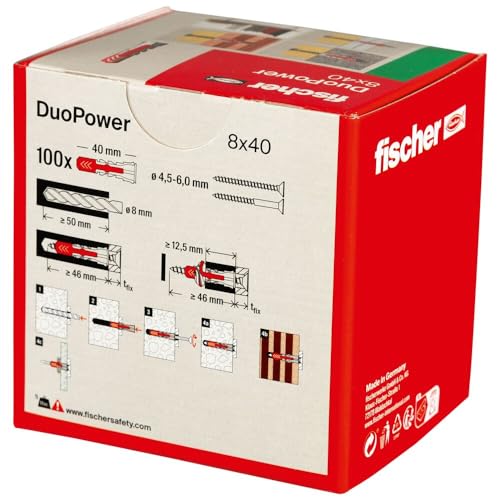 fischer DuoPower 8 x 40, Universaldübel, leistungsstarker 2-Komponenten-Dübel, Kunststoffdübel zur Befestigung in Beton, Ziegeln, Stein, Gipsbauplatten uvm., ohne Schrauben, 100 Stück