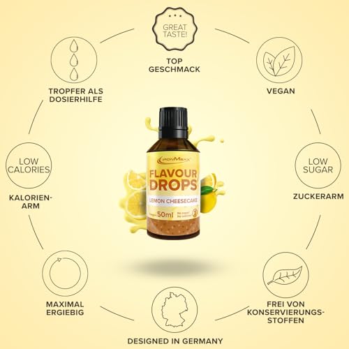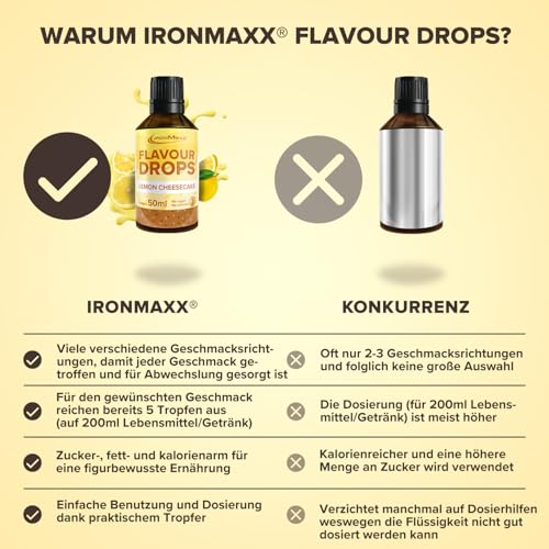IronMaxx Flavour Drops - Lemon Cheesecake 50ml | kalorienfrei & zuckerfrei | vegane Aromatropfen zum süßen von Lebensmitteln | praktischer Tropfer-Verschluss