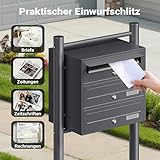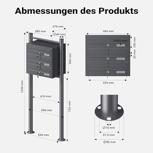 Wiltec 3er Briefkastenanlage Anthrazit 556 x 270 x 1200 mm, Standbriefkasten mit 3 Fächern, Schlüssel und Namensschild, Briefkasten Postkasten mit Ständer
