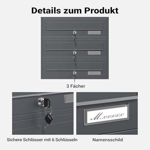 Wiltec - 3er Briefkastenanlage Anthrazit 512 x 270 x 1150 mm, Standbriefkasten mit 3 Fächern, Schlüssel und Namensschild, Briefkasten Postkasten mit