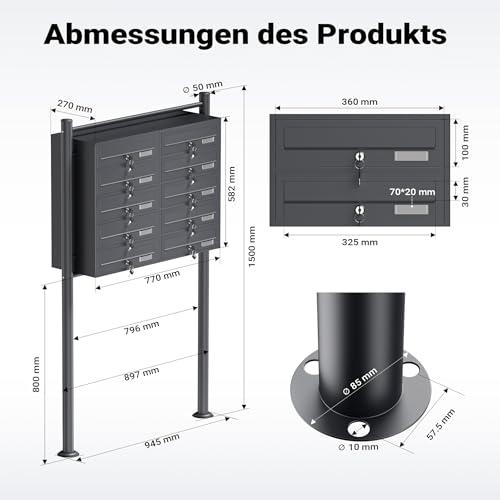 Wiltec 10er Briefkastenanlage Anthrazit 945 x 270 x 1500 mm, Standbriefkasten mit 2x5 Fächern, Schlüssel und Namensschild, Briefkasten Postkasten mit