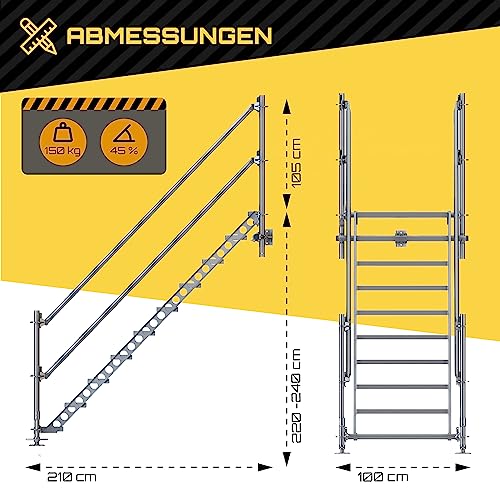 Scafom-rux Feuerverzinkte Bautreppe - [10 Stufen] Außentreppe mit Geländer - 2 Meter Höhe, 80 cm breit, Treppe außen - Stahltreppen für Gerüst und Garten - Aussentreppen Stahl - Treppen Bausatz