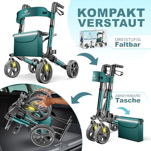 KESSER Leichtgewicht Rollator faltbar mit Sitz, Griff, Tasche, schmal für Senioren Wohnung, Klappbar, Höhenverstellbar, Reflektoren | All Gelände Reifen Indoor-& Outdoor, Gehhilfe, Laufhilfe, Petrol