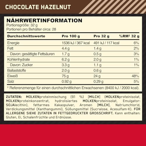 Optimum Nutrition Gold Standard 100% Whey Protein Schokolade Haselnuss 28 Portionen (896 Gramm) Einheitsfarbe 900g