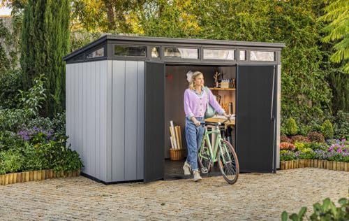 Keter Kunststoff Gerätehaus 11x7 – Wetterfestes Gartenhaus mit Boden, Doppeltüren & Fenster, Fahrradschuppen, Ideal für Outdoor-Geräteschuppen, 342x218x226cm