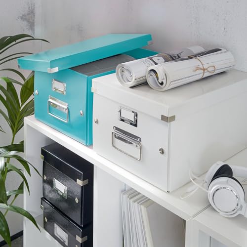 Leitz Click & Store Aufbewahrungsbox mit Deckel Mittel-Groß, Würfelbox für Regale im Wohnzimmer oder Büro, Transportbox aus 80 % recycelter Premium-Hartpappe, Stabile Metallgriffe, Eisblau, 61090051