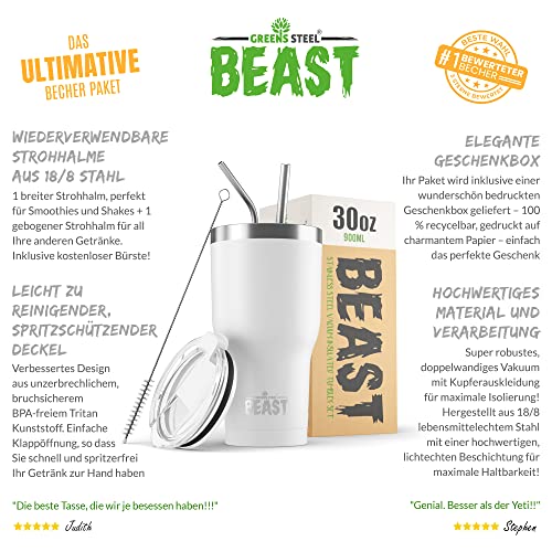 Beast Thermobecher 900 ml - Arktisches Weiß I Mehrweg Thermo Kaffeebecher To Go mit 2 Strohhalmen & Reinigungsbürste I Doppelwandiger Trinkbecher aus Edelstahl I Perfekt für Kaffee oder Eiskaffee