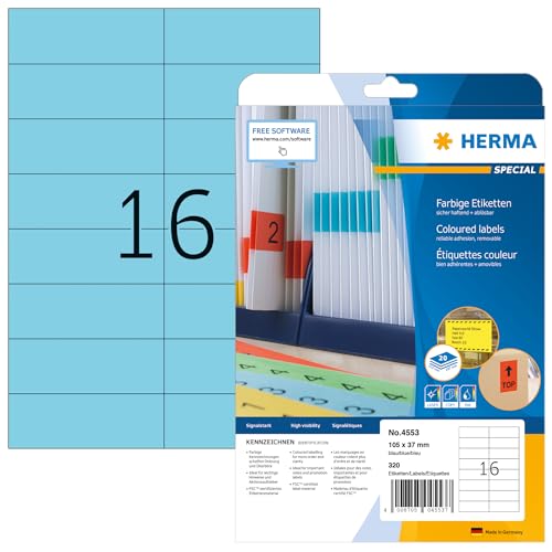 HERMA 4553 Farbige Etiketten blau ablösbar, 20 Blatt, 105 x 37 mm, 16 pro A4 Bogen, 320 Stück, selbstklebend, bedruckbar, matt, blanko Papier Farbetiketten Aufkleber