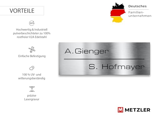 Metzler Briefkastenschild mit Lasergravur und Pulverbeschichtung anthrazit-schwarz 85x30 mm wetterfest rostfrei UV-beständig selbstklebend oder mit Bohrung zweizeilig pflegeleicht