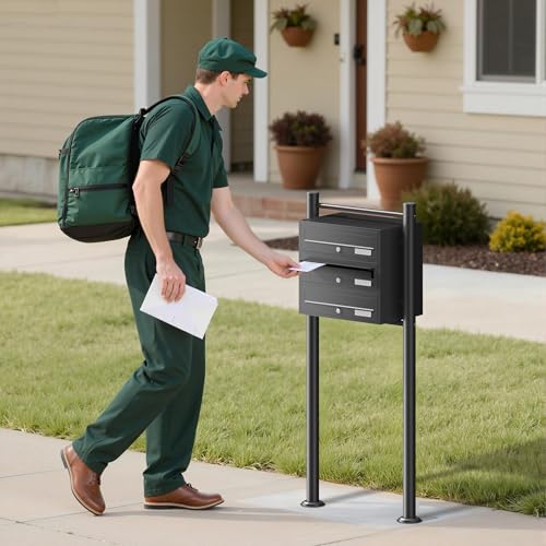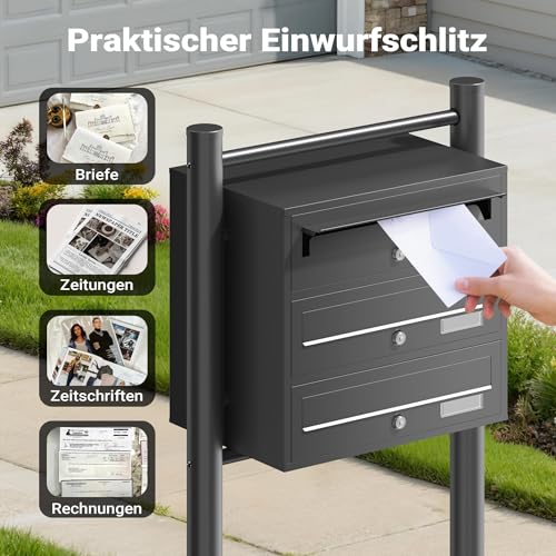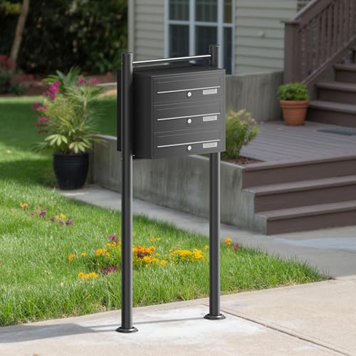 Wiltec 3er Briefkastenanlage schwarz 556 x 270 x 1500 mm, Standbriefkasten mit 3 Fächern, Schlüssel und Namensschild, Briefkasten Postkasten mit Ständer