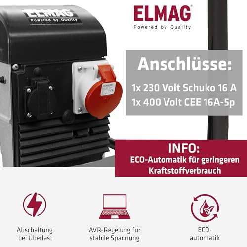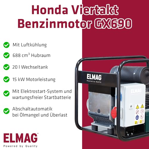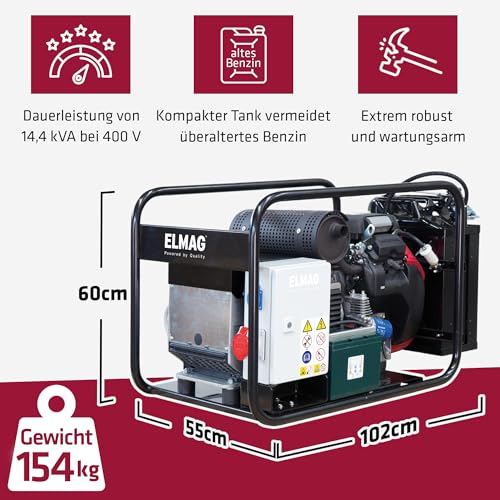ELMAG SEB 16000WDE-AVR Benzin Stromerzeuger – Notstromaggregat mit 4-Takt-Motor luftgekühlt, 15 kW & 20 l Tank – 1x 230 V Schuko & 1x 400 V CEE – Stromgenerator mit AVR, Handstart & Überlastschutz