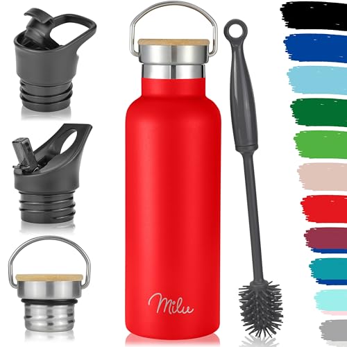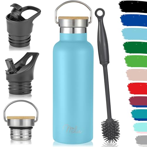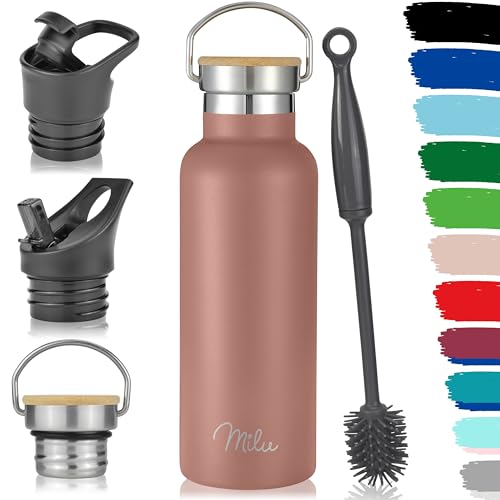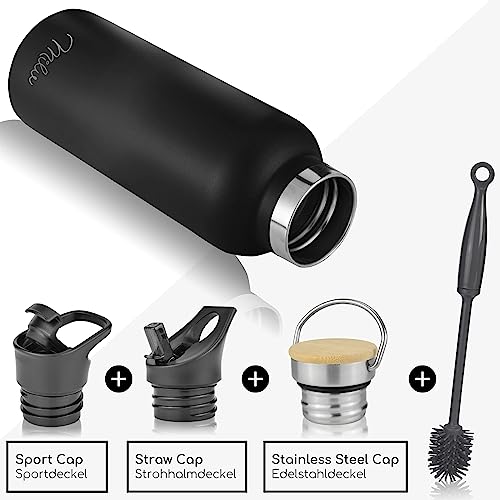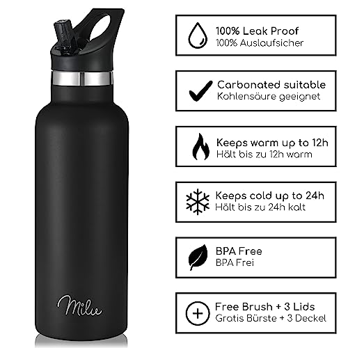 Milu Edelstahl Trinkflasche 500ml, 750ml, 1000ml (+3 Deckel) - Thermosflasche mit Strohhalm, Isolierte Wasserflasche, Auslaufsichere Isolierflasche doppelwandig, Kohlensäure geeignet (Schwarz, 500ml)