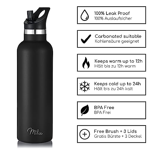 Milu Edelstahl Trinkflasche 500ml, 750ml, 1000ml (+3 Deckel) - Thermosflasche mit Strohhalm, Isolierte Wasserflasche, Auslaufsichere Isolierflasche doppelwandig, Kohlensäure geeignet (Schwarz, 750ml)