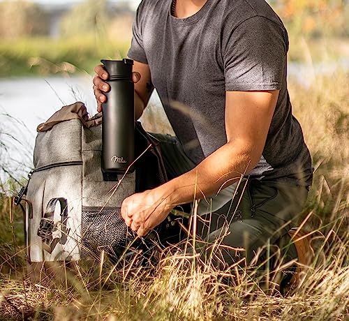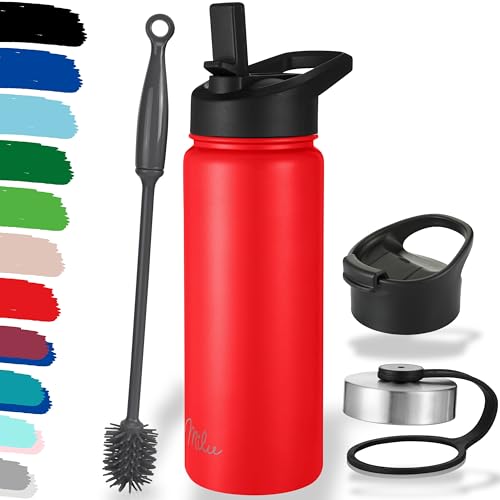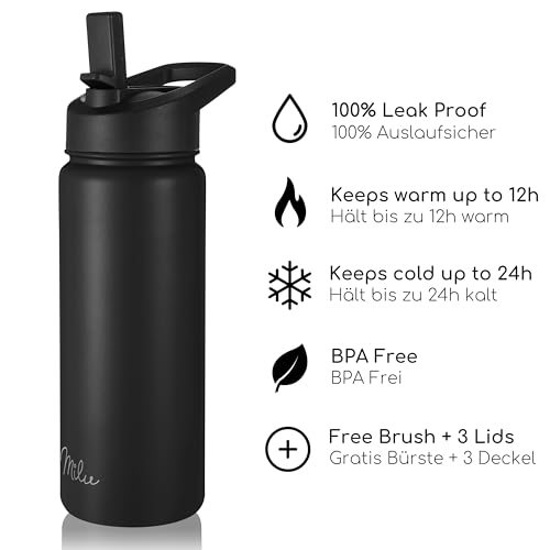 Milu Edelstahl Trinkflasche 500ml, 750ml, 1000ml (+3 Deckel) - Thermosflasche mit Strohhalm, Isolierte Wasserflasche, Auslaufsichere Isolierflasche doppelwandig, Kohlensäure geeignet (Schwarz)