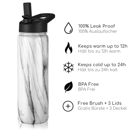 Milu Edelstahl Trinkflasche 500ml, 750ml, 1000ml (+3 Deckel) - Thermosflasche mit Strohhalm, Isolierte Wasserflasche, Auslaufsichere Isolierflasche doppelwandig, Kohlensäure geeignet (Marble, 750ml)