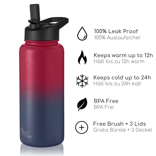 Milu Edelstahl Trinkflasche 500ml, 750ml, 1000ml (+3 Deckel) - Thermosflasche mit Strohhalm, Isolierte Wasserflasche, Auslaufsichere Isolierflasche doppelwandig, Kohlensäure geeignet (Berry Blau, 1L)