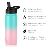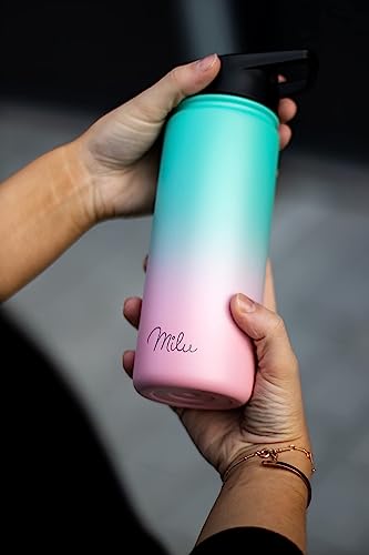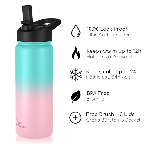 Milu Edelstahl Trinkflasche 500ml, 750ml, 1L (+3 Deckel) Thermosflasche mit Strohhalm, Isolierte Wasserflasche, Auslaufsichere Isolierflasche doppelwandig, Kohlensäure geeignet (Mint Rosa, 0,5 ml)