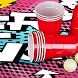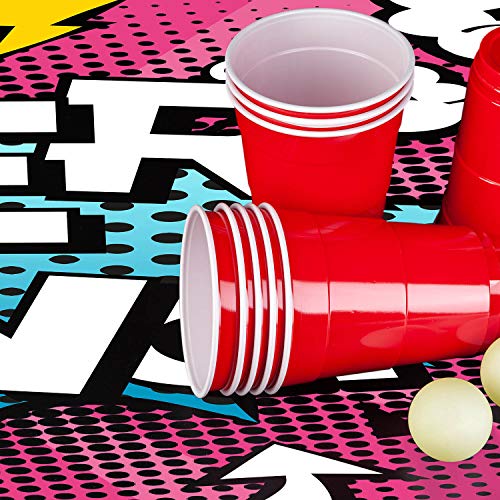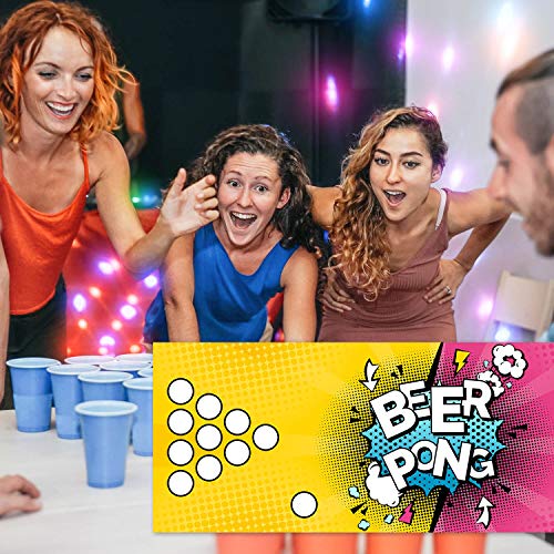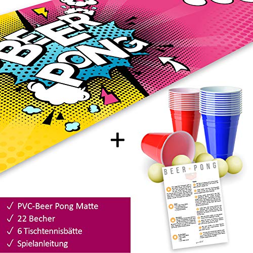 Beer Pong Set I 180 x 60 cm I Spielfeldmatte mit Pop Art Design I Inkl. 22 Partybechern und 6 Tischtennisbällen I Trinkspiel I Party-Spiele und Geburtstag I Wiederverwendbar und abwischbar I dv820
