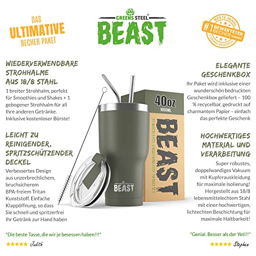 Greens Steel Beast Tumbler – 1050 ml (40 oz), Armeegrün | Wiederverwendbarer Edelstahl, vakuumisolierter Becher | mit 2 Strohhalmen & Reinigungsbürste | Doppelwandiger Reise-Thermobecher