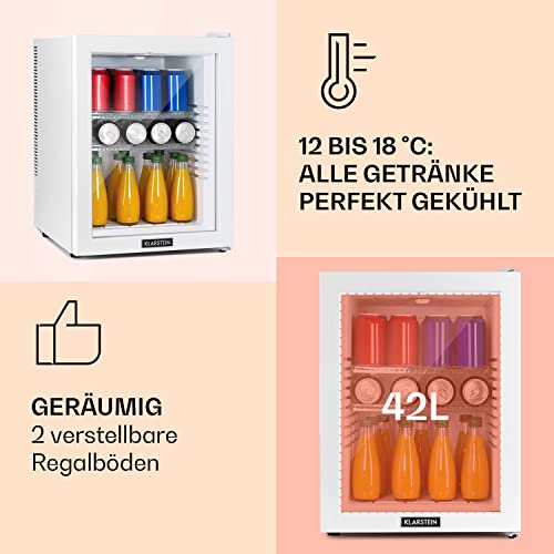 Klarstein Kühlschrank, Mini Kühlschrank mit Glastüre, Mini-Kühlschrank für Getränke, Snacks & Kosmetik, Kühlschrank Klein & Leise, Verstellbare Ablagen, Kleiner Skincare Kühlschrank 12-18°C, 42L