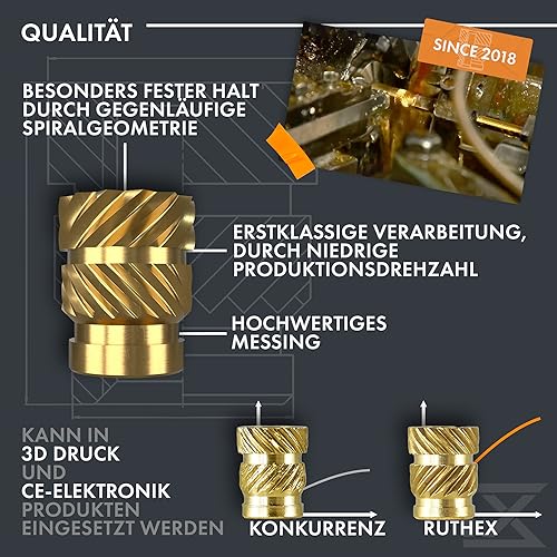 ruthex Gewindeeinsätze M2 + M3 + M4 + M5 Sortimentskasten - 70 + 100 + 50 + 50 Stk. BLEIFREIE Gewindebuchsen aus Messing - zum Einschmelzen einer Gewindehülse in 3D-Druck-Teile aus Kunststoff