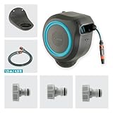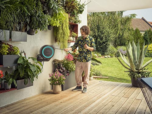 Gardena Wand-Schlauchbox RollUp M (türkis) 20m: Flexible Bewässerung für mittelgroße Gärten, schwenkbare Schlauchtrommel, mit Wandhalterung, Systemteilen und Spritze inkl. 20m Schlauch (18610-20)