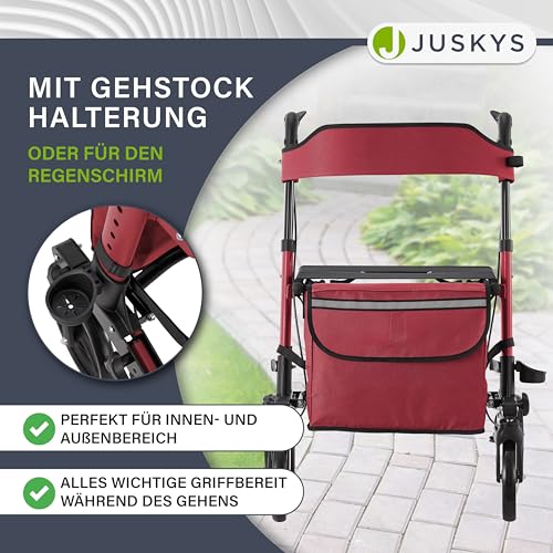 Juskys Rollator Vital rot - Gehhilfe faltbar & leicht aus Aluminium bis 130 kg - Laufhilfe höhenverstellbar mit Sitz, Tasche & Regenschirmhalterung