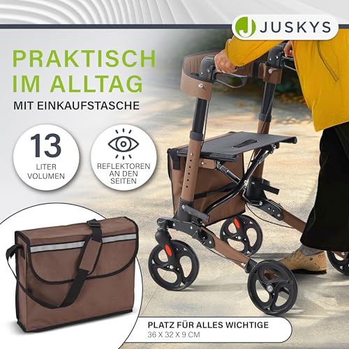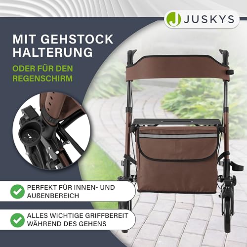Juskys Rollator Vital braun - Gehhilfe faltbar & leicht aus Aluminium bis 130 kg - Laufhilfe höhenverstellbar mit Sitz, Tasche & Regenschirmhalterung