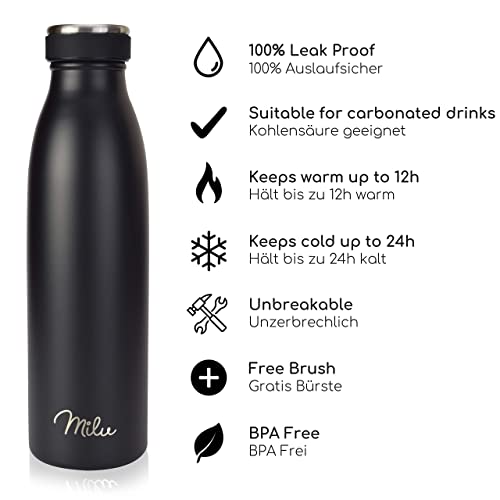 Milu Thermoflasche 350ml 500ml 750ml 1L 1,5L Isolierte Edelstahl Trinkflasche Thermoskanne Auslaufsichere Isolierflasche doppelwandig für heiße und kalte Getränke, Kohlensäure geeignet (Schwarz 500ml)