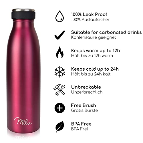 Milu Thermoflasche 350ml 500ml 750ml 1L 1,5L Isolierte Edelstahl Trinkflasche Thermoskanne Auslaufsichere Isolierflasche doppelwandig für heiße und kalte Getränke, Kohlensäure geeignet (Berry, 500ml)